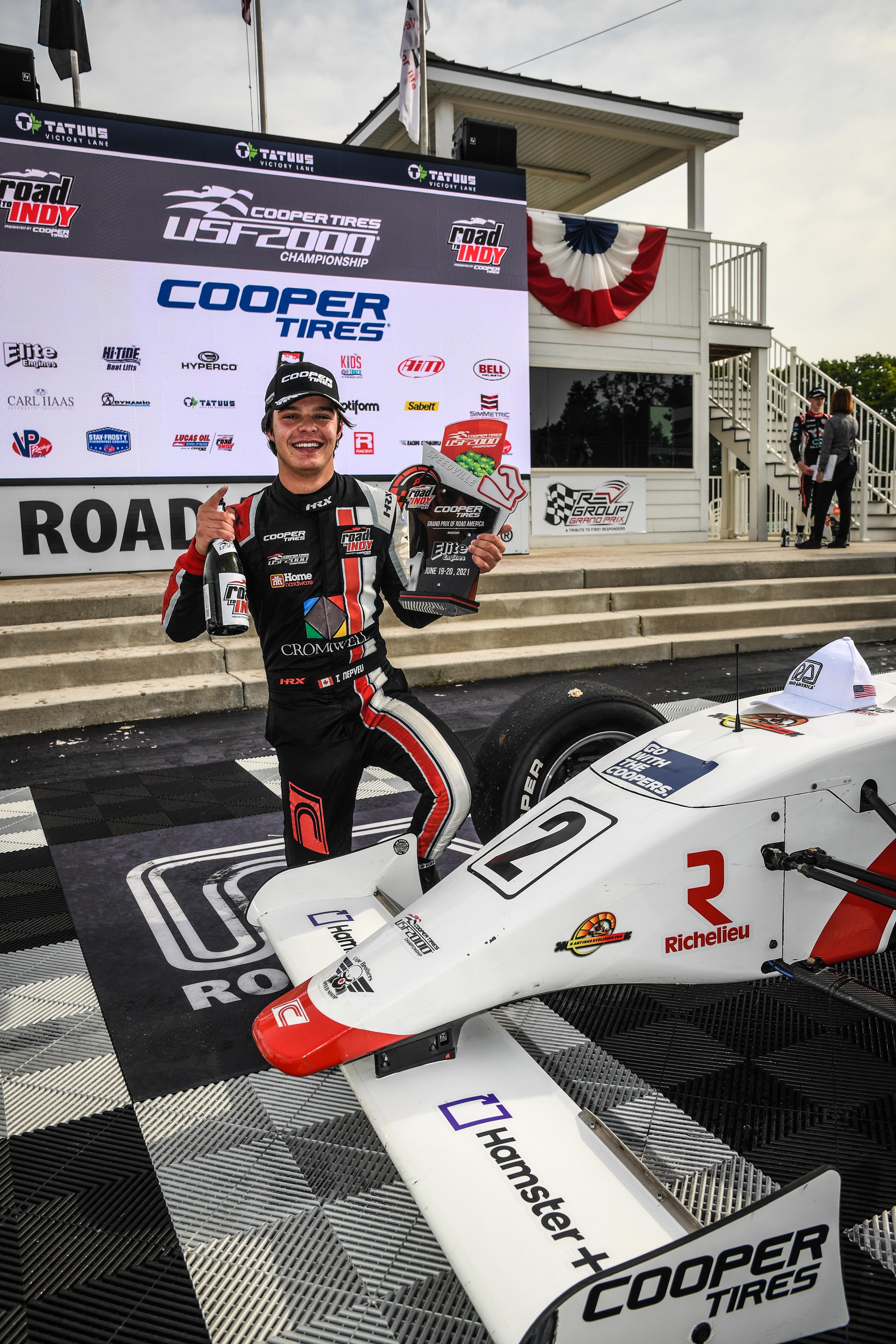 Quelle course pour Thomas Nepveu et sa voiture n°2 Cromwell| Karting Excellence | Home Hardware préparée par Cape Motorsports, qui ont remporté leur première victoire en série Cooper Tires USF200 aujourd'hui sur le légendaire circuit de Road America. La jeune recrue, qui en était à sa première visite sur ce circuit, a démontré à quel point son apprentissage a été efficace depuis le début de la saison, en menant la majorité des tours de la course et en livrant une bataille digne d'un vétéran avec un adversaire avant de croiser le fil d'arrivée vainqueur.